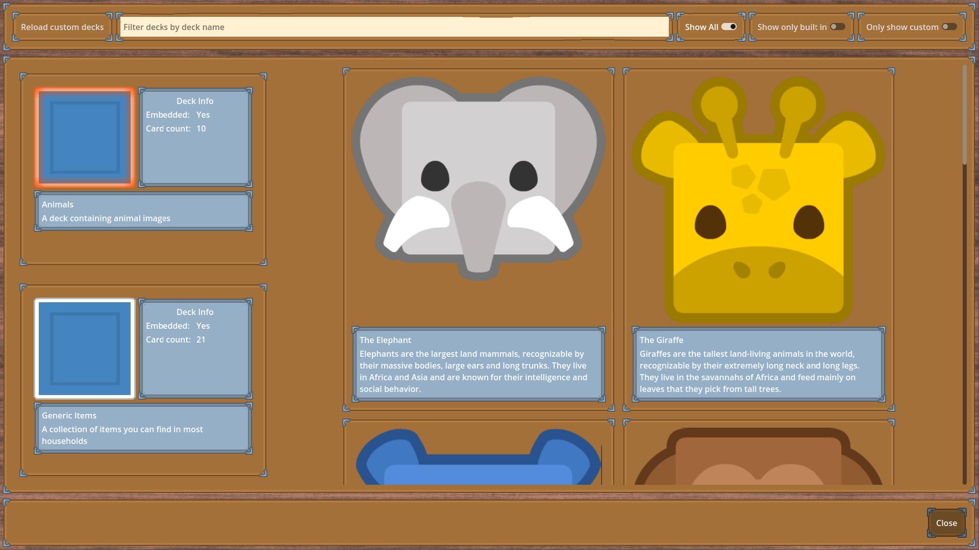 I did code this game as a hobby project, this is a digital memory game which does allow me to digitalize pictures drawn by my son. Since I did this via a side load approach by allowing the creation of custom decks you can import your own card decks.